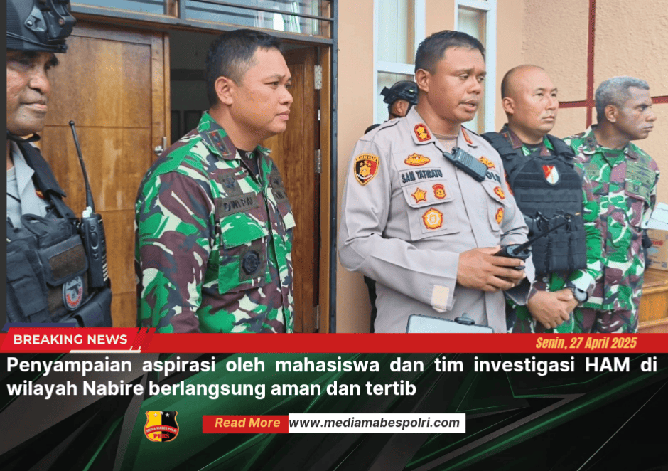 www.mediamabespolri.com |Nabire Papua Tengah – Penyampaian aspirasi oleh mahasiswa dan tim investigasi HAM di wilayah Nabire berlangsung aman dan tertib, Senin (27/4/2026). Pengamanan dilakukan secara terpadu sejak pagi hingga sore hari, dengan pendekatan humanis dan koordinasi lintas sektor.