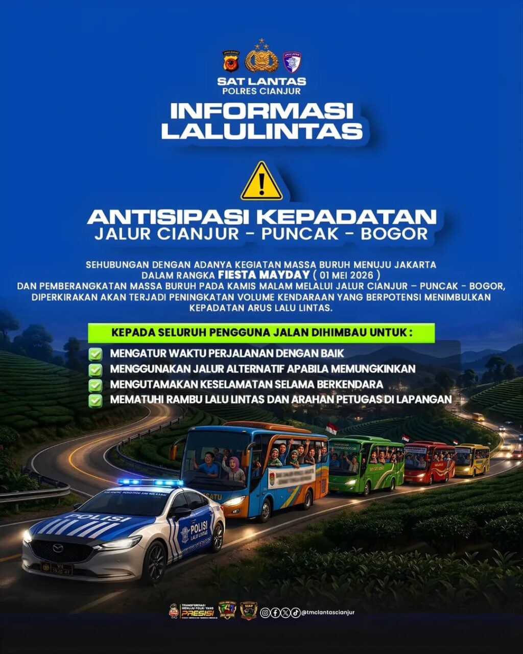 Cianjur — 28 April 2026 — Dalam rangka mengantisipasi potensi kepadatan arus lalu lintas di jalur Cianjur – Puncak – Bogor, sehubungan dengan adanya pergerakan massa buruh menuju Jakarta dalam rangka kegiatan Fiesta Mayday pada 1 Mei 2026, diperkirakan akan terjadi peningkatan volume kendaraan di sejumlah titik ruas jalan.