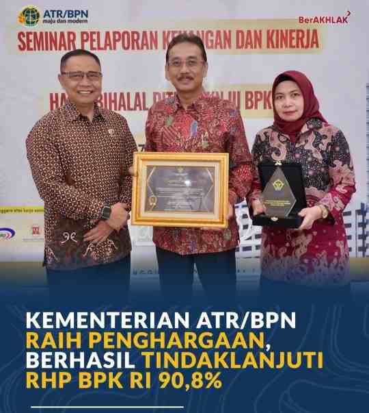 Jakarta — Kementerian Agraria dan Tata Ruang/Badan Pertanahan Nasional (ATR/BPN) kembali menorehkan prestasi dengan meraih penghargaan dari Badan Pemeriksa Keuangan (BPK) Republik Indonesia. Penghargaan tersebut diberikan atas capaian tindak lanjut Rekomendasi Hasil Pemeriksaan (RHP) yang mencapai 90,8 persen.