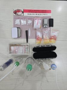 Dari hasil penggeledahan di dalam ruko, petugas menyita tiga bungkus sabu dengan berat bruto 11,8 gram yang disimpan di dalam kotak kacamata di area dapur. Selain itu, ditemukan lima alat hisap (bong), empat alat takar dari pipet, satu timbangan digital, serta sejumlah plastik klip kosong.