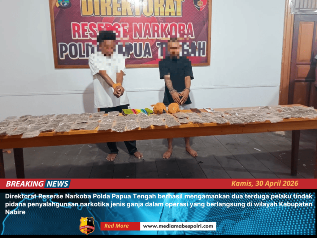 www.mediamabespolri.com |Nabire, Papua Tengah – Direktorat Reserse Narkoba Polda Papua Tengah berhasil mengamankan dua terduga pelaku tindak pidana penyalahgunaan narkotika jenis ganja dalam operasi yang berlangsung di wilayah Kabupaten Nabire, Papua Tengah, Kamis 30/4/26. Penindakan tersebut dilakukan berdasarkan SPRINTGAS Nomor: SP.Gas / 07 / IV / RES 4.2 / 2026.