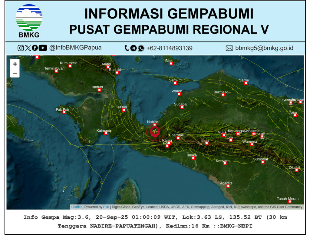 Nabire//  20 September 2025 – Setelah diguncang gempa berkekuatan 6,6 magnitudo pada Jumat dini hari, wilayah Nabire, Papua Tengah, kembali merasakan gempa susulan pada Sabtu, 20 September 2025 pukul 01:00 WIT.