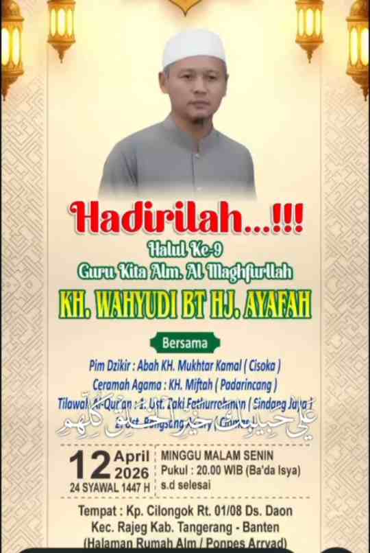 Tangerang — Masyarakat Desa Daon, Kecamatan Rajeg, Kabupaten Tangerang, bersiap menggelar acara haul ke-9 untuk mengenang sosok ulama kharismatik yang telah wafat (almarhum maghfullah). Kegiatan religius ini dijadwalkan berlangsung pada Minggu malam Senin, 12 April 2026 atau bertepatan dengan 24 Syawal 1447 Hijriah, mulai pukul 22.00 WIB hingga selesai.