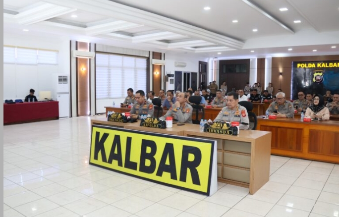 Pontianak, KalbarMediamabespolri.com Kapolda Kalimantan Barat, Irjen Pol Dr. Pipit Rismanto, S.I.K., M.H., didampingi Waka Polda Kalbar Brigjen Pol. Hindarsono, S.I.K., S.H., M.Hum., Irwasda Polda Kalbar, Kombes Pol. Sigit Jatmiko, S.H., S.I.K., dan para Pejabat Utama Polda Kalbar menghadiri pembukaan Rapat Kerja Teknis (Rakernis) Gabungan Polri Tahun 2026 secara virtual melalui Zoom Meeting dari Graha Khatulistiwa Polda Kalbar. (Selasa, 31/3)