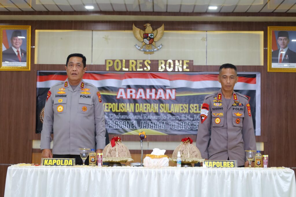Kapolda Sulawesi Selatan Irjen Pol. Djuhandhani Rahardjo Puro, S.H., M.H. melaksanakan kunjungan kerja ke Polres Bone, Senin 06/04/2026 Kunjungan tersebut bertujuan untuk memberikan arahan serta penguatan kepada seluruh personel dalam pelaksanaan tugas kepolisian di wilayah hukum Polres Bone.