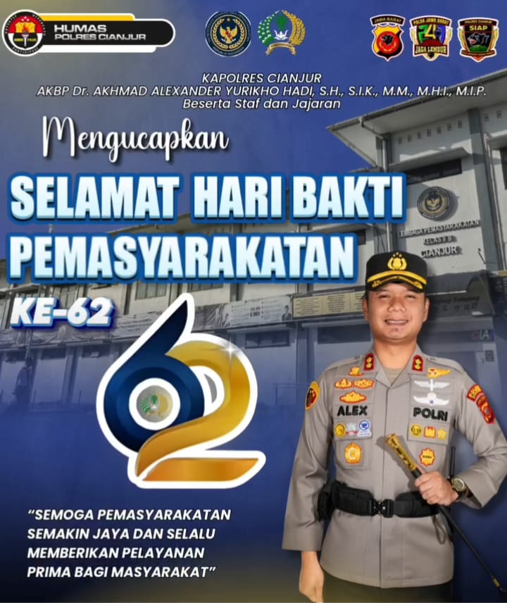 Cianjur — 27 April 2026 – Dalam rangka memperingati Hari Bakti Pemasyarakatan (HBP) ke -62 tahun 2026, Polres Cianjur menyampaikan ucapan selamat sekaligus apresiasi kepada seluruh insan pemasyarakatan atas dedikasi dan pengabdian yang telah diberikan.