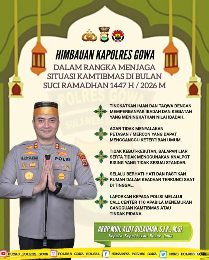 Pada Hari Kamis 19/02/2026 Kapolres Gowa Muhammad Aldy Sulaiman, S.I.K, M.Si. menyampaikan imbauan kepada seluruh masyarakat Kabupaten Gowa, untuk menjaga situasi keamanan dan ketertiban masyarakat (kamtibmas) tetap kondusif selama Bulan Suci Ramadan 1447 H/2026 M, di Wilayah Hukum kab Gowa Provinsi Sulawesi Selatan.