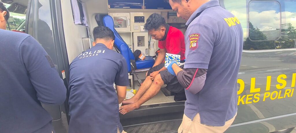 Personel yang berada di lokasi kejadian dengan sigap mendatangi korban untuk memberikan penanganan medis awal. Pertolongan yang diberikan meliputi perawatan luka serta pemberian obat-obatan guna membantu kondisi korban dan mencegah terjadinya dampak yang lebih serius.