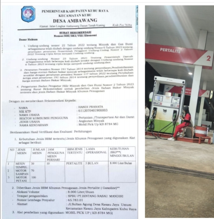 > “Perlu kami tegaskan bahwa penjualan BBM menggunakan jerigen tidak dilarang oleh peraturan, asalkan dilengkapi rekomendasi resmi dari pemerintah desa atau kecamatan setempat. Dalam hal ini, SPBU 65.783.01 Rasau Jaya telah memiliki rekomendasi dari Desa Air Putih, Desa Ambawang, Desa Olak Olak Kubu, serta rekomendasi resmi dari Pemerintah Kecamatan Kubu,” ujar Nanda Wahyu Pratama, A.Md., S.H., kuasa hukum SPBU.