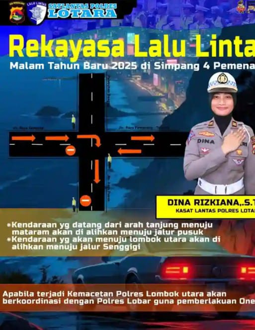 Dalam menjelang pergantian tahun 2025 ini Kapolres lombok Utara Melalui kepala satuan lalulintas(kasat lantas)lombok Utara iptu Dina Rizkiana S.trk siaga untuk mengatur arus lalu lintas di simpang 4 pemeng.