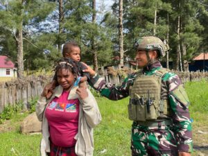 [ KAGO ] – Satgas Yonif 700/Wira Yudha Cakti kembali menunjukkan kedekatannya dengan masyarakat Papua melalui kegiatan Binter Terbatas yang digelar lewat Safari Honai di Kampung Kago, Distrik Ilaga, Kabupaten Puncak. (24 Juli 2025). Dalam kegiatan ini, para prajurit menyapa warga dari rumah ke rumah, tak sekadar bertukar sapa, tapi juga membagikan permen kepada anak-anak Kampung Kago. Dipimpin oleh Sertu Apolos, momen sederhana ini menjadi penuh makna ketika permen yang dibagikan bukan hanya sebagai bingkisan manis, tetapi simbol kasih sayang dan perhatian dari aparat negara kepada generasi muda Papua.