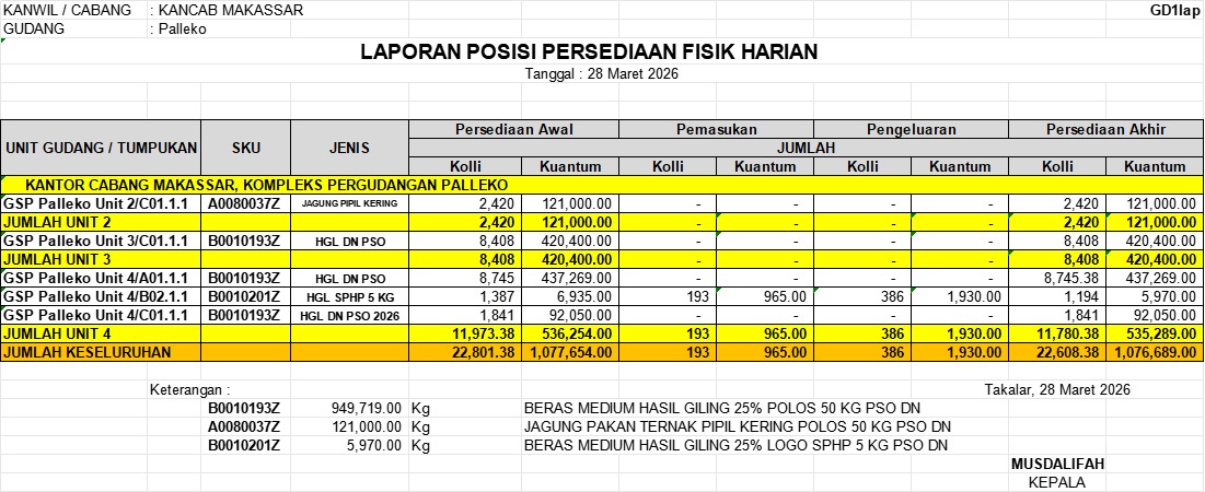Untuk memastikan ketersediaan stok beras di Kabupaten Takalar, Personel yang menjabat Piket Koramil 1426-01/Polombangkeng Utara Kodim 1426/Takalar rutin setiap hari melaksanakan pemantauan ketersediaan beras di Gudang Bulog Kelurahan Malewang Kecamatan Polombangkeng Utara Kabupaten Takalar Provinsi Sulawesi Selatan. Minggu, 29/03/2026.