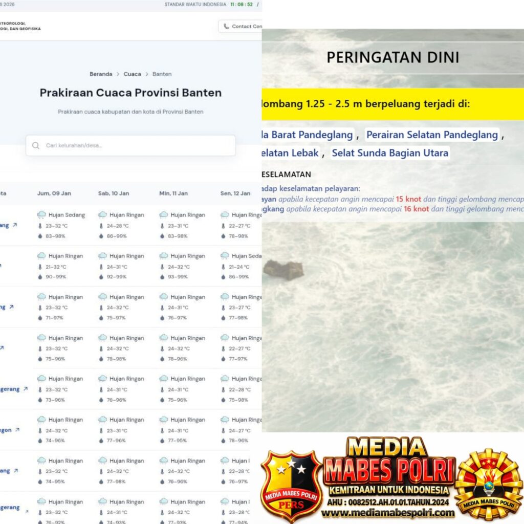 Serang – Polda Banten mengimbau masyarakat untuk meningkatkan kewaspadaan terhadap potensi cuaca yang tidak menentu berdasarkan pembaruan informasi dari Badan Meteorologi, Klimatologi, dan Geofisika (BMKG) Banten per Jum’at (09/01).