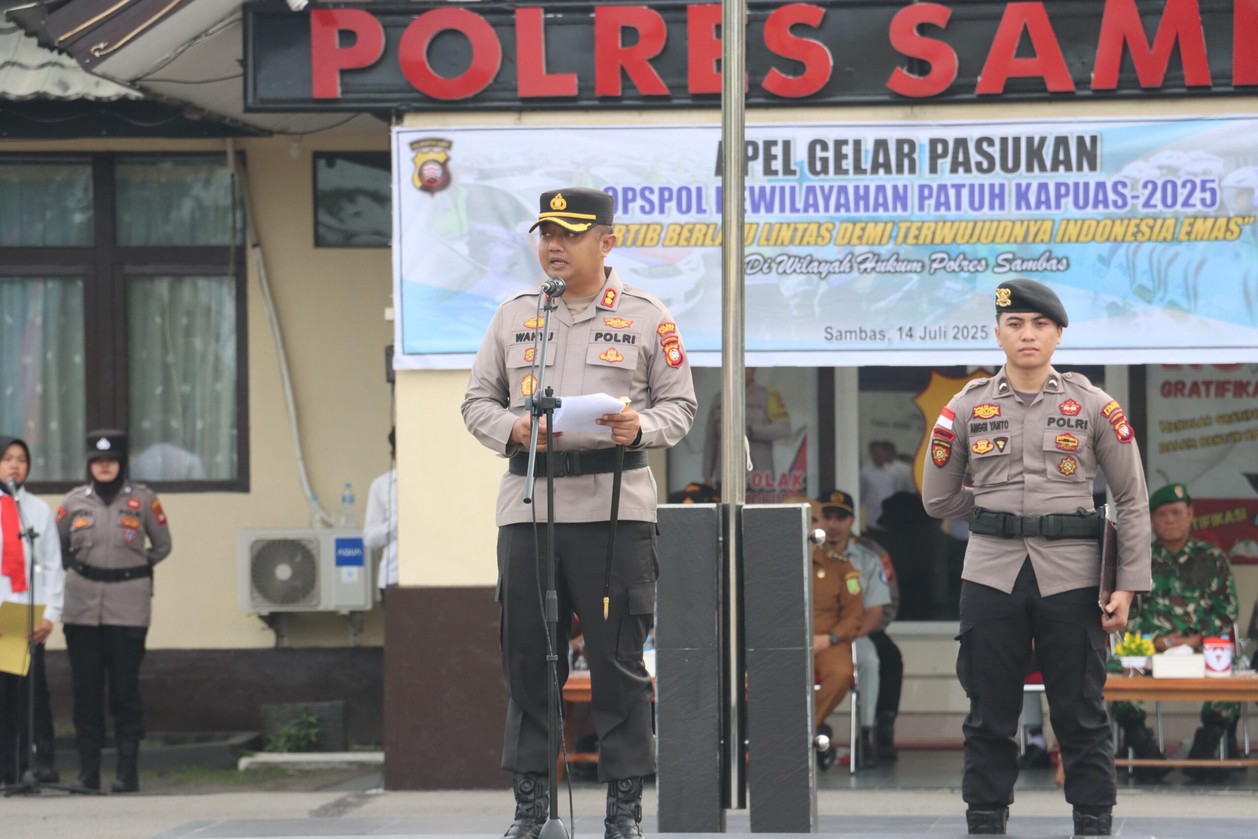 Mediamabespolri.com, Sambas Kalbar – Polres Sambas, Polda Kalbar, Dalam rangka pelaksanaan Operasi Kepolisian Kewilayahan Patuh Kapuas Tahun 2025, Polres Sambas menggelar Apel Gelar Pasukan pada Senin, 14 Juli 2025, sekitar pukul 07.40 WIB di halaman Mapolres Sambas. Apel ini dipimpin langsung oleh Kapolres Sambas AKBP Wahyu Jati Wibowo, S.I.K., S.H., M.H.