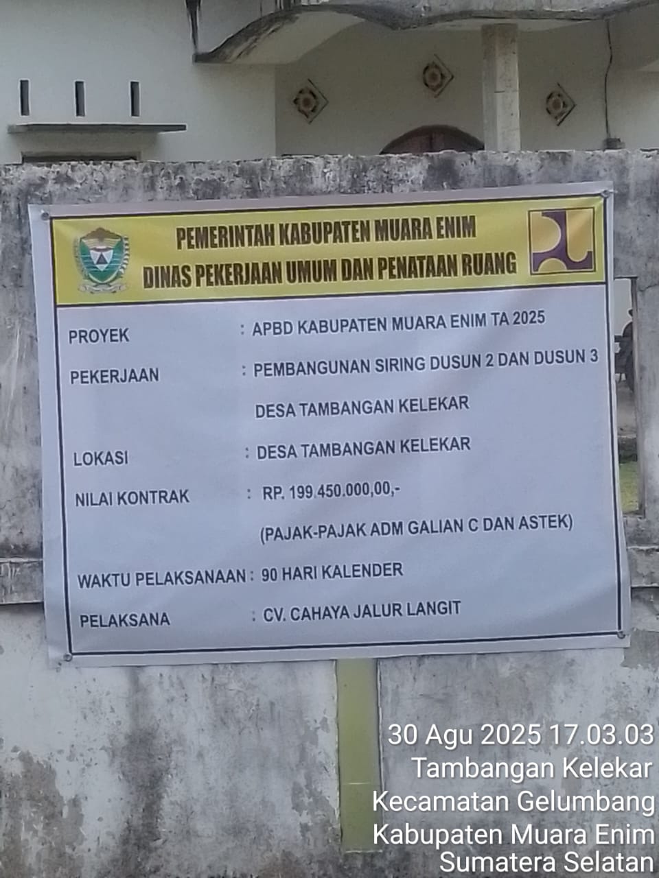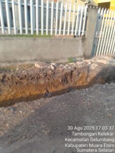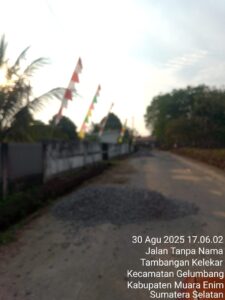 Pembangunan siring pasang berlokasi di Wilayah Desa Tambangan Kelekar Kecamatan Gelumbang Kabupaten Muara Enim, tepatnya Desa Tambangan Kelekar, diduga dikerjakan asal jadi diperparah lagi dengan tak terlihat dari galian dan batu ampar nya di jalan, Senin (01/09/2025).