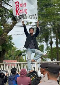 Selain membakar ban, para demonstran juga membentangkan spanduk tuntutan serta menyampaikan orasi secara bergantian menggunakan mobil komando. Situasi sempat memanas saat massa terlibat aksi saling dorong dengan aparat keamanan yang berjaga.