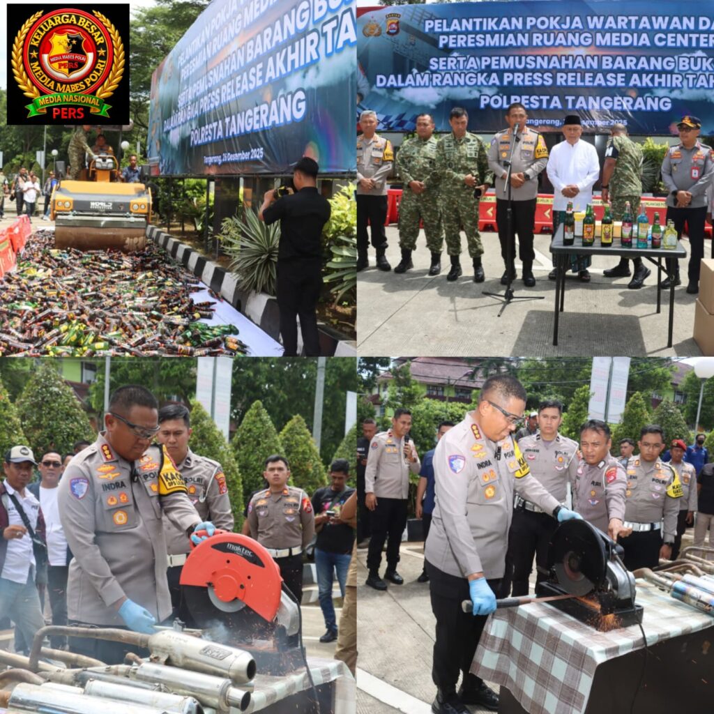 Dalam rangkaian Rilis Akhir Tahun, Polresta Tangerang juga melakukan pemusnahan barang bukti berupa 135 dus berisi 1.860 botol minuman keras, 70 bilah senjata tajam, serta 27 knalpot brong hasil Operasi Patuh.