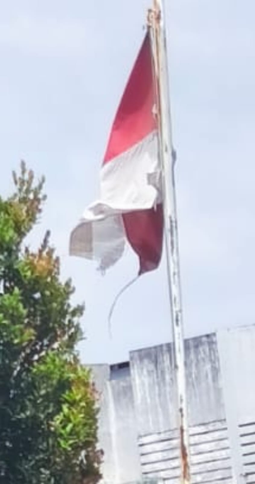 Pantauan di lokasi pada Jumat 27 Maret 2026 menunjukkan bendera yang seharusnya menjadi lambang kehormatan dan kedaulatan bangsa justru terlihat tidak layak untuk dikibarkan. Warna merah dan putih tampak memudar, bahkan terdapat bagian yang sobek. Hal ini menimbulkan pertanyaan publik terkait kepedulian dan tanggung jawab pihak instansi terhadap simbol negara.