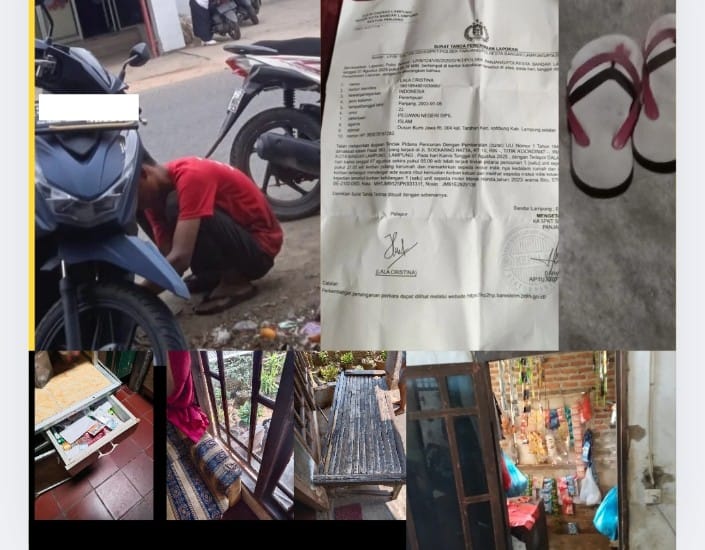 (Pelaku) meninggal kan barang Bukti (BB) sepasang sandal Swalow warna merah didalam rumah korban.Dari kejadian tersebut, korban Lala Cristina melapor ke Polsek panjang kota Bandar Lampung.Dengan nomor Surat tanda Terima laporan:LP/B/124/VIII/2025.SPKT Polsek Panjang-Polresta kota Bandar Lampung.Kejadian Kamis 7 Agustus 2025 Sekira Pukul 05:00 Subuh.