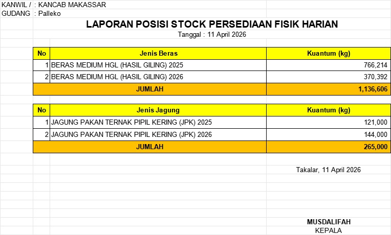 Program Percepatan Penyerapan Gabah/Beras Bulan April 2026 Kanwil Bulog Kab. Takalar sampai saat ini berjalan dengan aman dan lancar sesuai dengan apa yang telah direncanakan. Pendim1426.