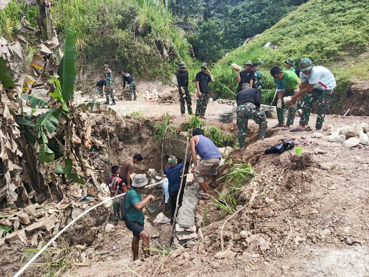 Satgas TMMD dan Warga Bangun Fondasi Penahan Jalan Rawan Longsor di Pekalobean.