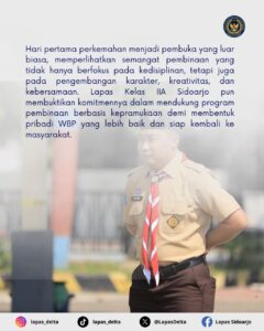 Hari pertama perkemahan menjadi pembuka yang luar biasa, memperlihatkan semangat pembinaan yang tidak hanya berfokus pada kedisiplinan, tetapi juga pada pengembangan karakter, kreativitas, dan kebersamaan. Lapas Kelas IIA Sidoarjo pun membuktikan komitmennya dalam mendukung program pembinaan berbasis kepramukaan demi membentuk pribadi WBP yang lebih baik dan siap kembali ke masyarakat.