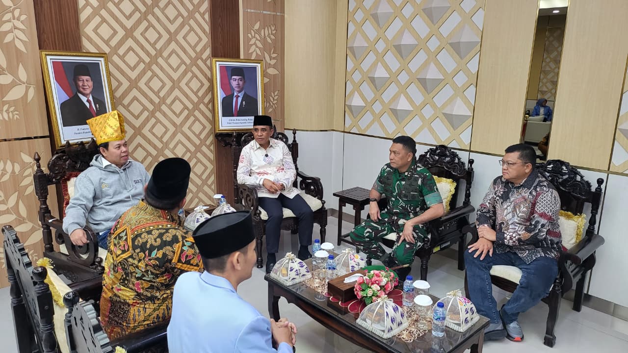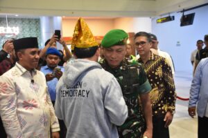Palu // Panglima Komando Daerah Militer XXIII/Palaka Wira, Mayjen TNI Jonathan Binsar Perluhutan Sianipar, bersama Gubernur Sulawesi Tengah, Dr. H. Anwar Hafid, M.Si., menyambut kedatangan Ketua Dewan Perwakilan Daerah Republik Indonesia (DPD RI), Sultan Baktiar Najamudin, dalam kunjungan kerja di Kota Palu, Minggu (14/9/2025).
