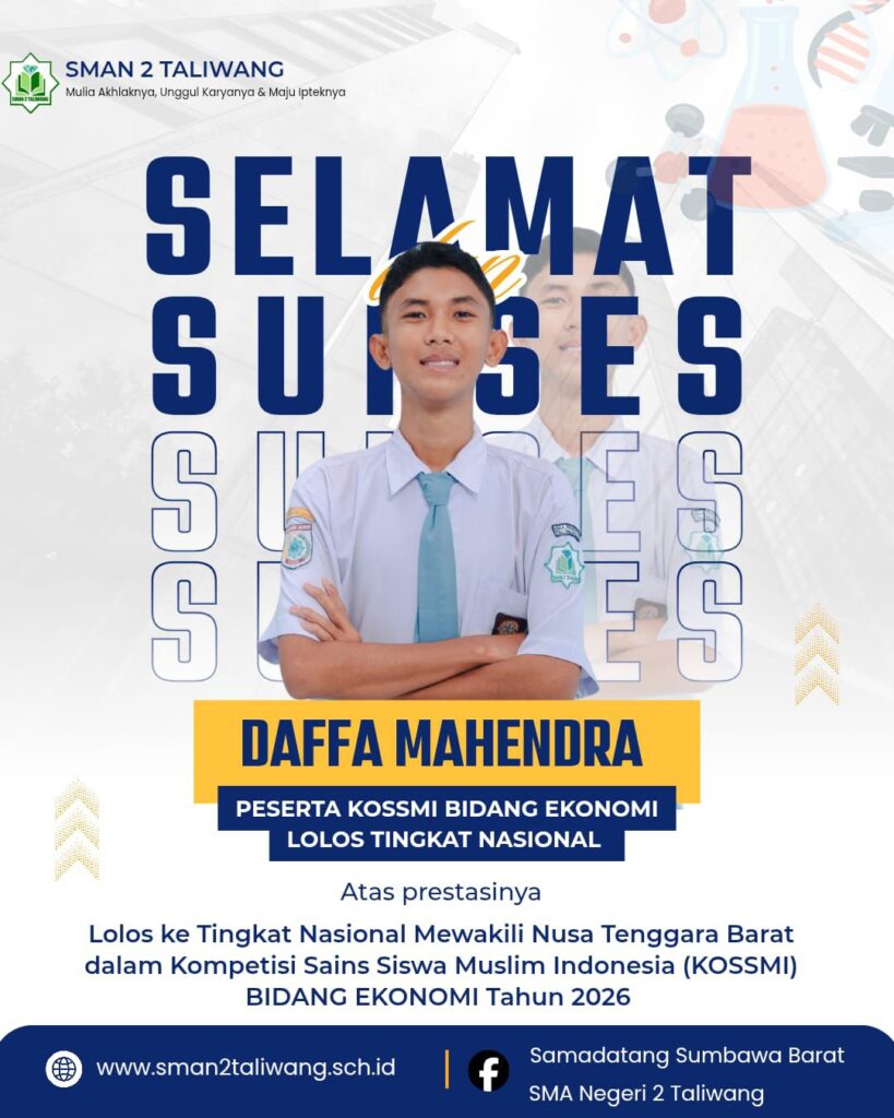 Taliwang, mediamabespolri.cim (19/04) Prestasi membanggakan kembali ditorehkan oleh siswa SMAN 2 Taliwang. Ananda Daffa Mahendra berhasil lolos ke tingkat nasional dalam ajang Kompetisi Sains Siswa Muslim Indonesia (KOSSMI), sebuah kompetisi bergengsi yang mempertemukan pelajar terbaik dari seluruh Indonesia dalam bidang sains.
