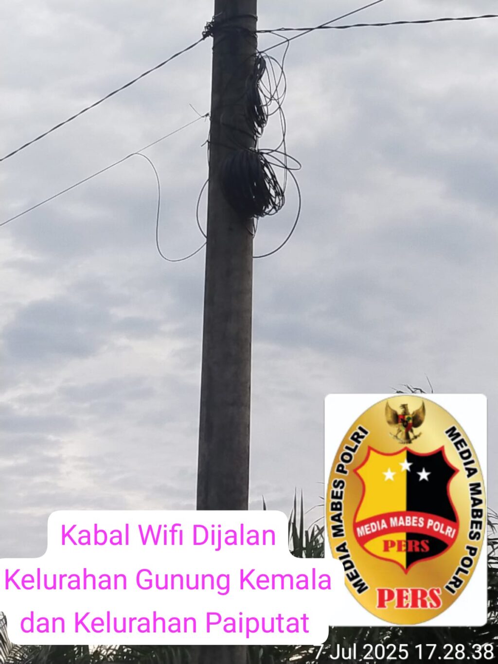03 Agustus 2025,” Terlihat kabel ( Wifi )yang sangat tidak beraturan menempel di tiang listrik PLN dikhawatirkan dapat memicu adanya korsleting dan juga sangat mengangu kenyamanan masyarakat. Keberadaan lokasi pemasang kabel wifi Jl.Raya Gunung Kemala .Kelurahan, Payu Putat, Kec. Prabumulih Bar., Kota Prabumulih, Sumatera Selatan 31141 Provinsi Sumatera Selatan (Sumsel).