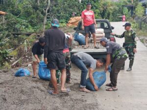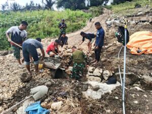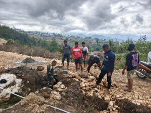 Di tengah teriknya matahari, suara cangkul, dentingan palu, dan tawa ringan menjadi saksi keakraban antara TNI dan warga. Tidak ada jarak di antara mereka—semua larut dalam semangat gotong-royong demi kemajuan desa.