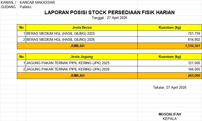 Stok 1.516 ton ini napasnya Takalar. Tugas kami pastikan angkanya riil, gudangnya aman, distribusinya siap kalau dibutuhkan. Selama TNI cek tiap hari, masyarakat tidak perlu khawatir,” tegas Pelda Mansyur.