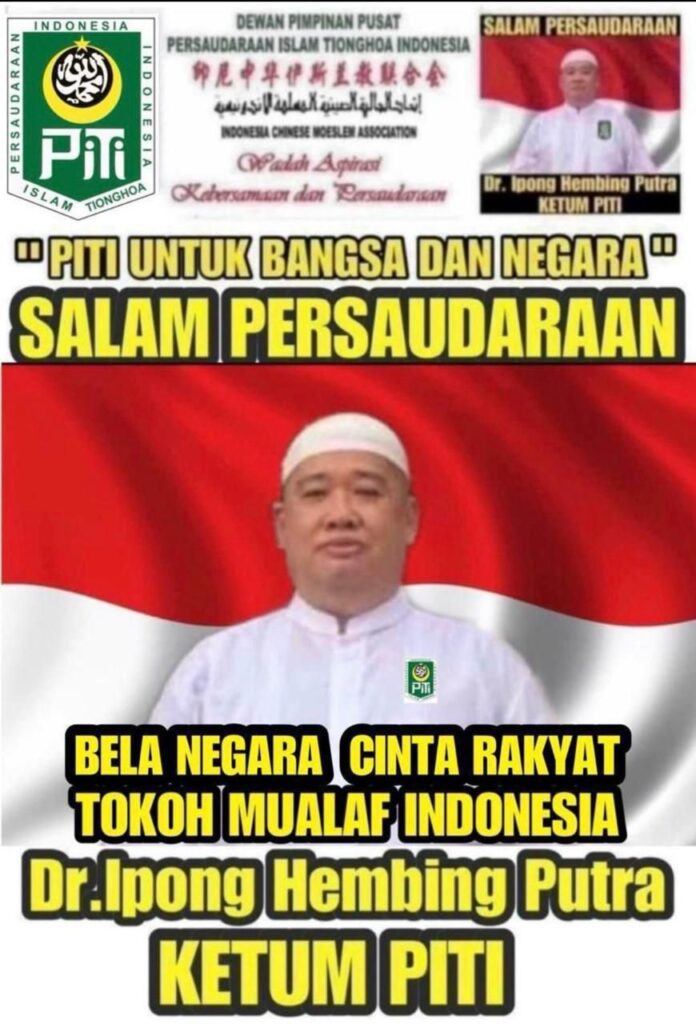 Dengan penuh rasa syukur dan kebahagiaan, saya Dr. Ipong Hembing Putra, Ketua Umum Persaudaraan Islam Tionghoa Indonesia (PITI), mengucapkan Selamat Hari Raya Idul Fitri 1 Syawal 1447 H kepada seluruh jajaran pengurus pusat maupun daerah, serta masyarakat seluruh Indonesia.