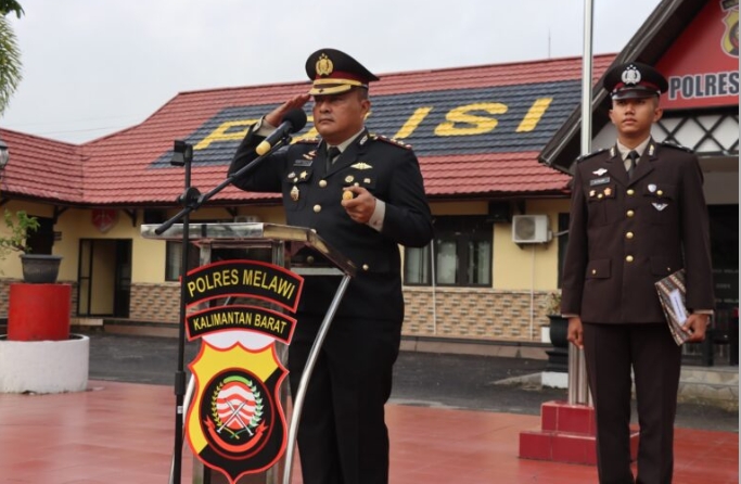 Kapolres Melawi Polda Kalimantan Barat, AKBP Harris Batara Simbolon, S.I.K., S.H., M.Tr.Opsla., bertindak sebagai Inspektur Upacara dan membacakan Naskah Amanat Presiden Republik Indonesia.