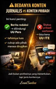 “Beda antara konten jurnalis dan konten pribadi adalah kunci penting. Berita redaksi dilindungi UU Pers, tapi status pribadi wartawan bisa kena UU ITE,” jelasnya.